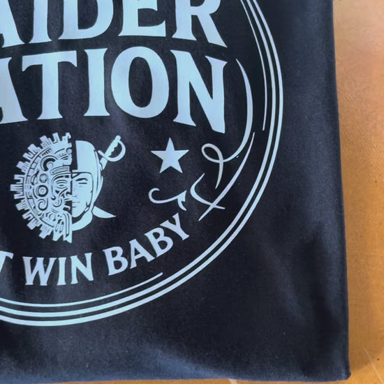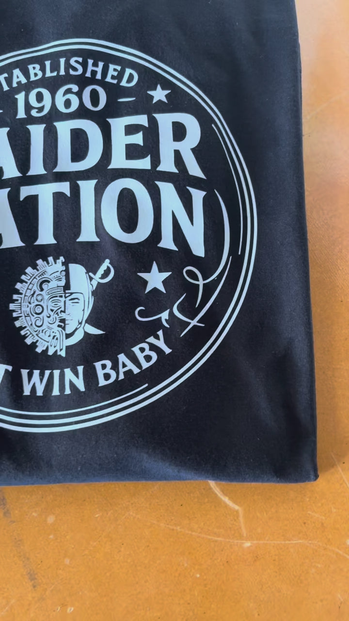 Show your pride in true Raider Nation style with this bold, vintage-inspired tee from Old School Print Shop (OSPS). Featuring the classic “Established 1960” and the legendary motto “Just Win Baby,” this design pays tribute to the silver and black with an old school edge.