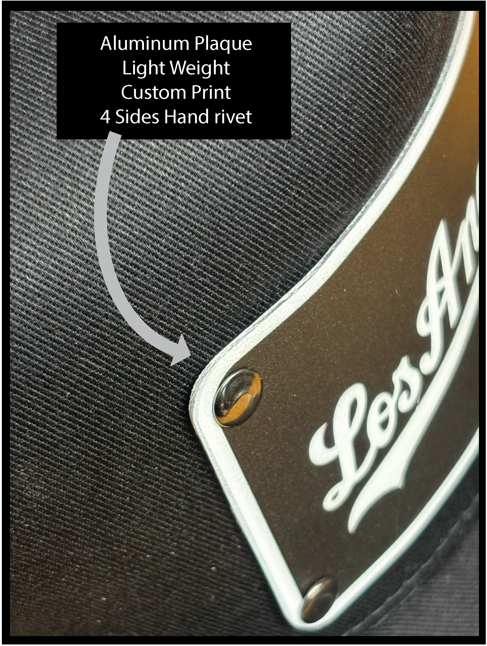 • Real aluminum-style plaque — full-color printed, drilled and mounted by hand