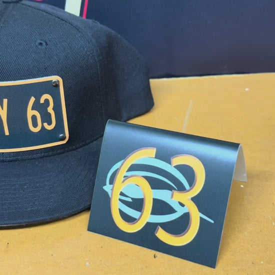 A custom lowrider dash sign featuring the bold yellow-orange txt with a playful Felix the Cat graphic integrated inside the number. The design is printed on a sleek black background and displayed in a tent-fold style, making it perfect for showing off on a classic car dashboard at shows or meets.