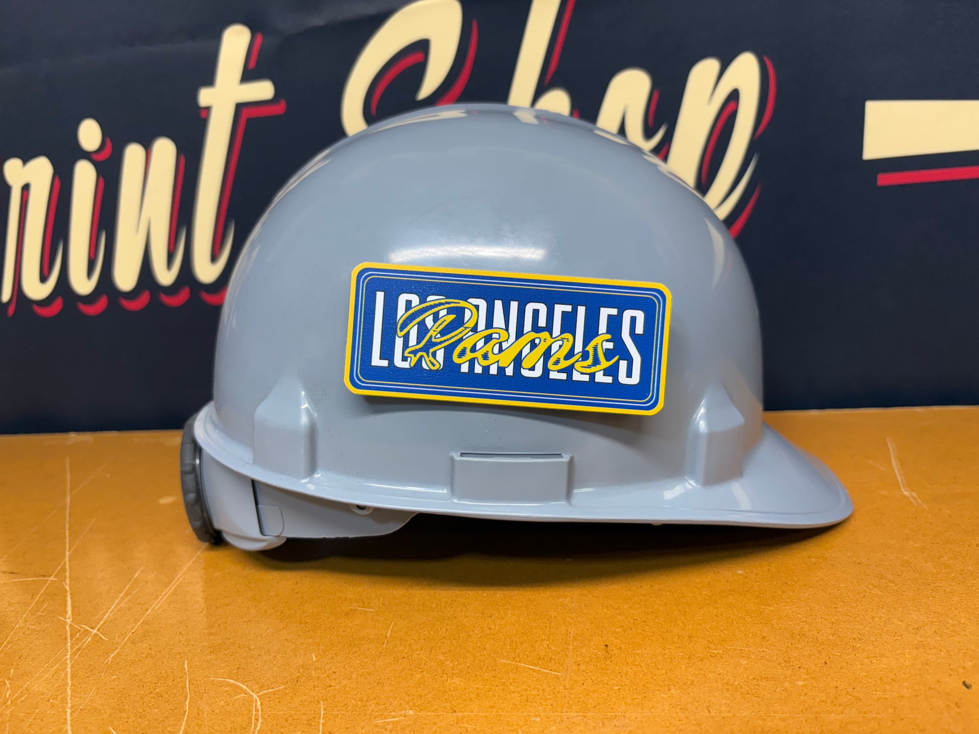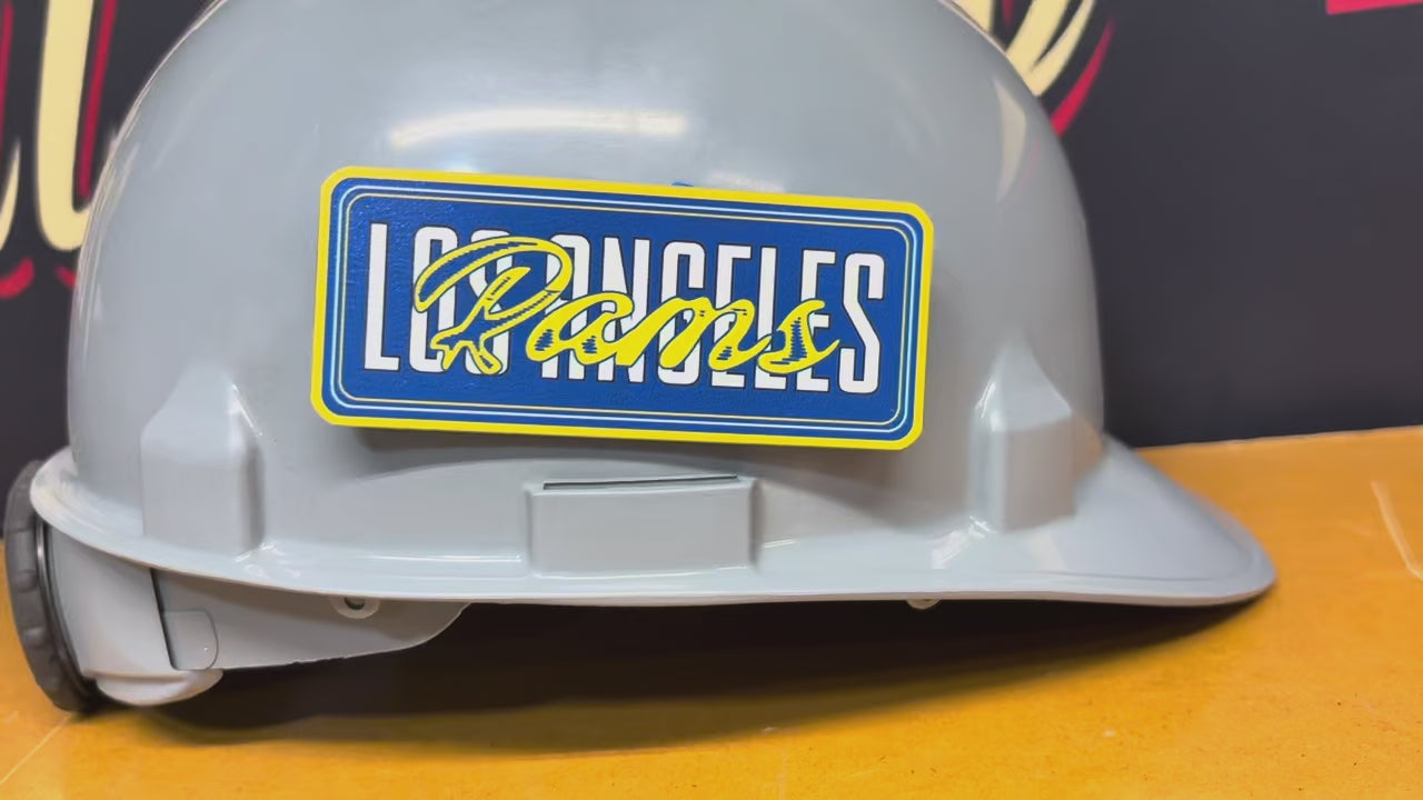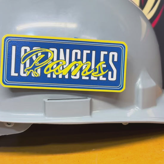 Rep your team with pride wherever you go! This Rams Pinstripe Design adhesive plaque is built tough and designed to stick on hard hats, toolboxes, lockers, and more. Made with a durable aluminum-style finish and bold lettering, it gives your gear that authentic old school vibe. Easy to apply, long-lasting, and perfect for die-hard Raider Nation fans who want to show loyalty on the job site or in the garage.