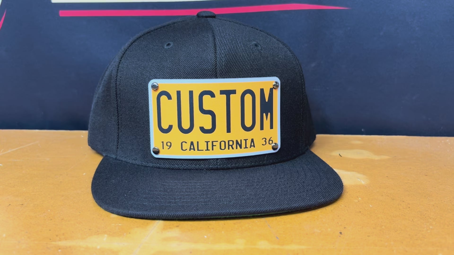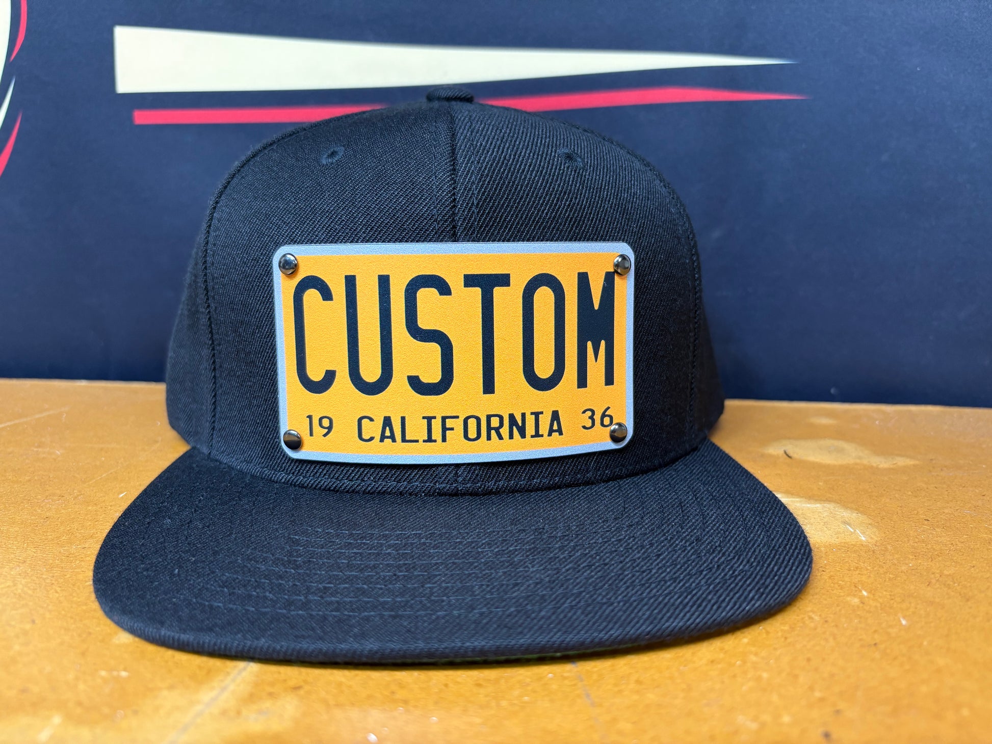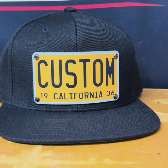 Built on a premium black snapback, this design features a full-color aluminum plaque inspired by vintage license plates — customized with your name, crew, or city.