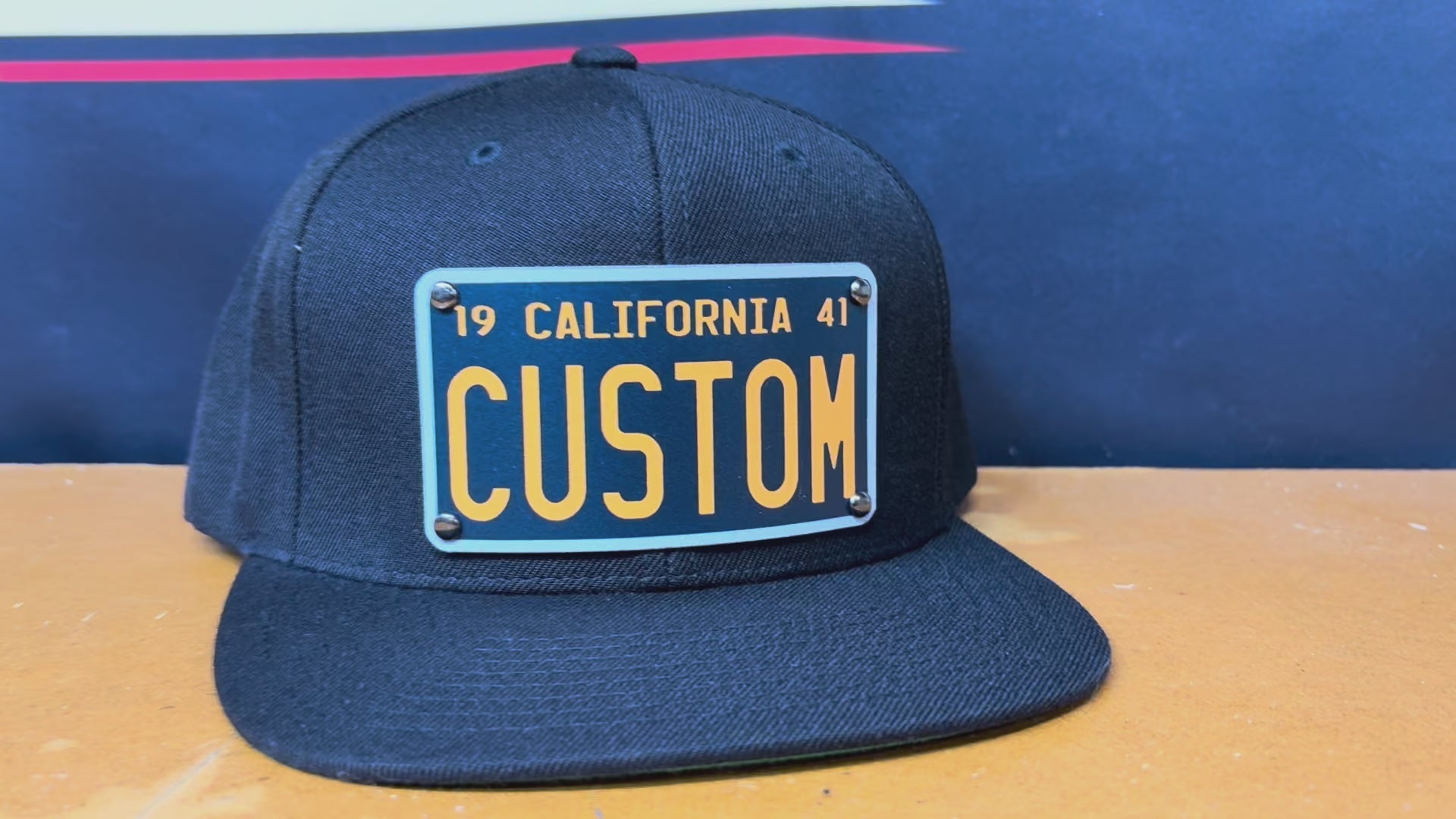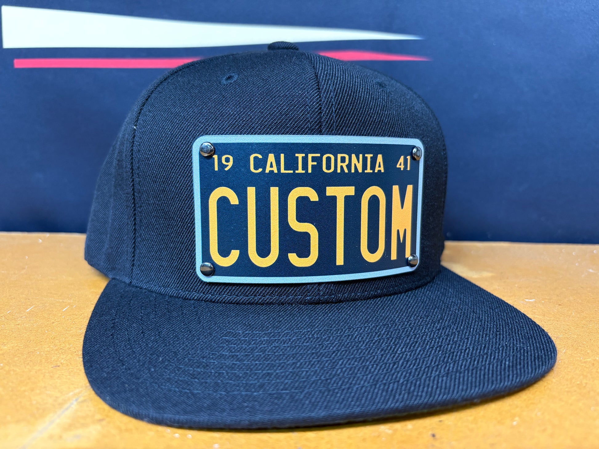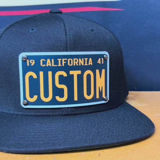 Built on a premium black snapback, this design features a full-color aluminum plaque inspired by vintage license plates — customized with your name, crew, or city.