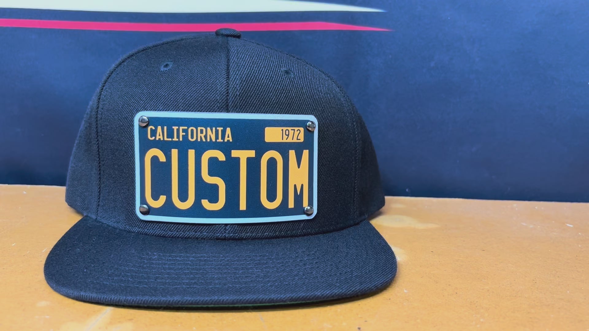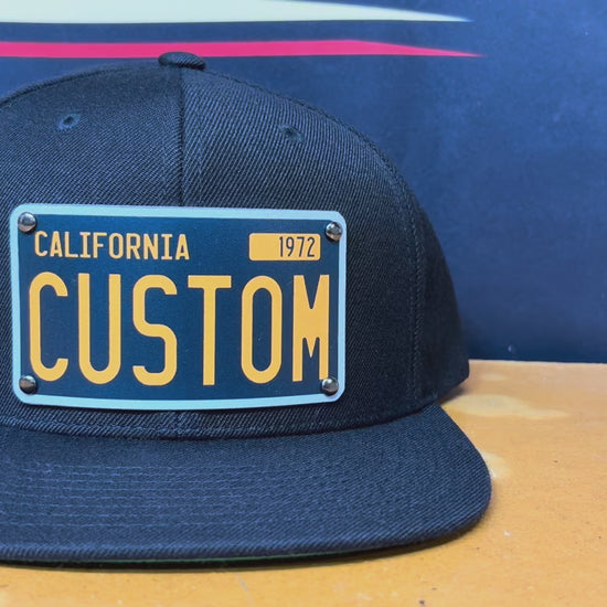 Built on a premium black snapback, this design features a full-color aluminum plaque inspired by vintage license plates — customized with your name, crew, or city.
